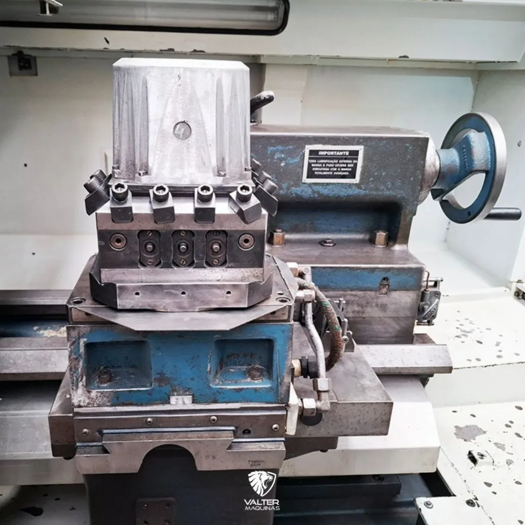 A máquina possui uma distância entre pontas de 3000 mm, permitindo usinar peças extremamente longas.